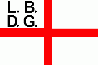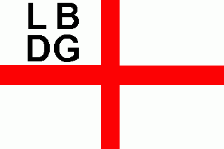 The flag (see left image above) was white, divided by a red centred cross, in the canton was a black inscription "LB"(1st line) "DG" (2nd line). As J. A. Suckau there is the same flag, but initials are dotted (see right image above).