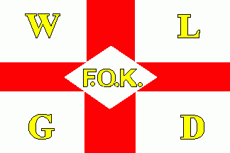 In the centre of the flag is a blue lozenge containing white capitals "FOK".