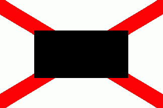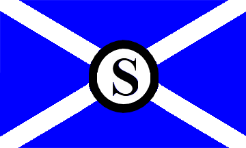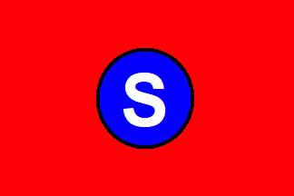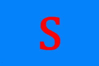 The flag is quartered per saltire, black in the top quarter, white in the bottom one and red in the other two. The white base quarter has a black sans serifed capital "S" (see left image above) or a red, serifed initial "S" (see right image above) in centre.