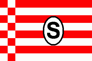 The flag is white with a narrow chequy band at the hoist, consisting of 9x2 red and white squares, and a sans-seriffed black "S" capital centered