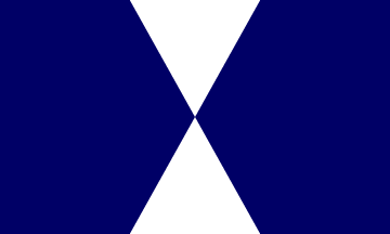 The flag is blue with a device in the center composed of two white triangles facing each other.