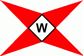 with a black initial ‘W’ inside; radiating from the lozenge are red
