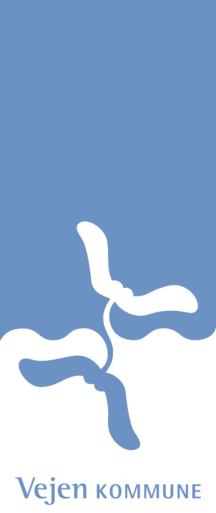 It is a banner of arms with the basic fields parted approximately 2:1 with blue inscription at the bottom edge "Vejen" (slightly bigger) "KOMMUNE"