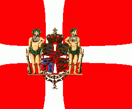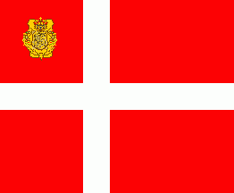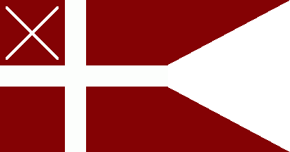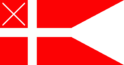 The ensign is a usual Danish military flag, i.e. red off-centred parted by a white cross patty.