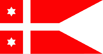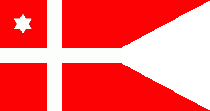 It is a split flag with a white six-pointed star in the first quarter. The basic colour is dannebrogsrød.