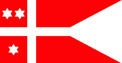 It is a split flag with white six-pointed stars, two in the first quarter and one in the third. The basic colour is Dannebrogsrød.