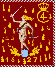both Argent, and a quiver with three arrows with white feathers. She stands on a blue globe winged Or. On base is a golden number "1627". On upper fly is the golden cypher "C4" of the king.