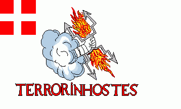 The central charge is a white armed arm coming out of clouds of greyish blue, holding four grey thunderbolts and two flames proper. Beneath is an inscription in red initials "TERROR IN HOSTES"