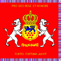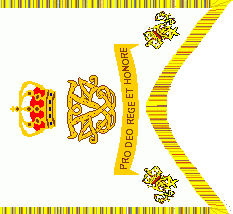 The guidons were swallow tailed with golden fringes. On centre was the golden dual cypher of the king, reading "F4", surmounted by a royal crown.