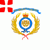 Under the shield is a golden wreath. On top and bottom are mottos in golden initials,