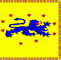 The cloth was yellow with golden fringes on three edges and displayed a sinister facing blue lion passant surrounded by nine red heartlets.