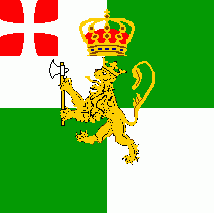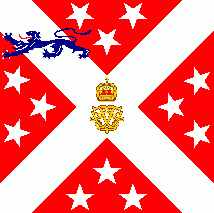 The cloth was red parted by a white saltire. Each quarter was charged with three white 5-point stars ordered 1:2 from centre. On canton was a dark blue lion passant tongued red.