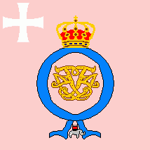 The cloth was pale red with a white cross patty in canton. On centre was the dual cypher of the king, reading "F4", surrounded by the blue ribbon of the Order of the Elephant and surmounted by a royal crown.