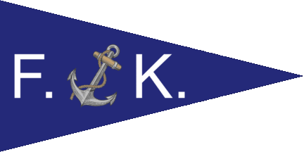 The pennant is dark blue with a silver anchor in bend sinister with golden stock and rope, flanked on either side by white dotted initials "F." (hoist) and "K." (fly).