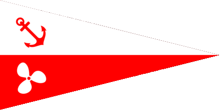 The pennant is horizontally parted of white and red. At hoist is a red anchor in bend above and a white ship propeller beneath.