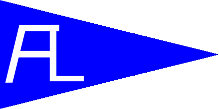 The name literally means "Pleasure Boat Guild" horizontally divided of white and red. At hoist is a blue anchor in bend above and a white inscription "ASK" below..The pennant is blue with connected white initials "AL", either thin (see left image above) or bold (see right image above) shifted to hoist. Amtoft is a hamlet in the Arup Parish near Thisted.