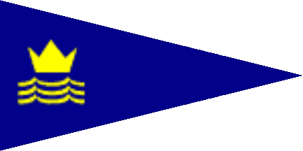 The pennant is dark blue, shifted to hoist is a stylised yellow crown above from three wavelets yellow.