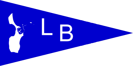 The pennant is light blue with a white sailing ship without hulk at hoist and black initials "L" and "S" flanking black steering wheel.