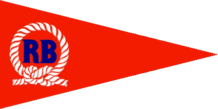 The pennant is white. Shifted to hoist is a red fowl anchor in pale, surrounded by red initials "RY"(top), "B"(hoist) and "L"(fly). The whole is flanked on either side by three blue wavy lines ordered per pale.