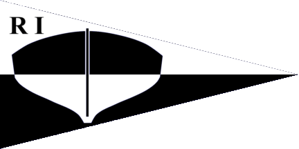 The pennant is horizontally parted of white over black. Shifted to hoist is a ship hulk seen from prow. In canton is a black inscription "RI".