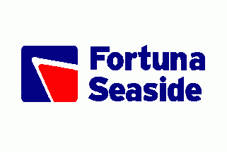 The company is based in Hellerup, just north of København. The flag is white with a dark blue inscription "Fortuna" (1st line) "Seaside" (2nd line) shifted to fly. Near hoist in a dark blue square with rounded corners is a red prow with white edge.