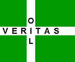 The 1st flag was green parted by an off-centred white cross with black inscription "VERITAS" on horizontal bar and "OIL" on vertical bar. The ratio is the same as that one of the Danish national flag (see left image above).