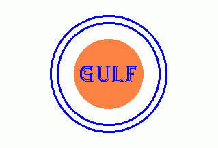 The 2nd flag was white with a centred orange disc with blue inscription "GULF" with shadow lines, all surrounded by two thin blue annulets (see right image above).