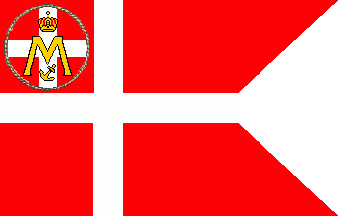 I spotted this flag inside an antiques shop in Hillerød in North Sealand (Denmark) on 9 June 2016. It is a Danish split flag with a badge in the canton as follows: in a golden segmented annulet is a throughout white Greek cross, superimposed by a golden cypher "M", topped by a crown, and beneath an anchor in bend sinister, all charges are golden fimbriated black.