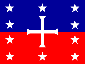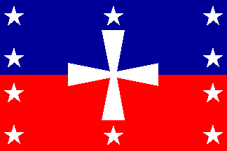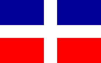 According to Corre's 2001 article [cor01a], the members of the secret society Trinitaria allied to Haitian liberals to form a common front against (Haitian) Boyer's regime, thus explaining the “Haitian” origin of the Trinitaria flag. This Trinitaria flag thought to be the origin of the Dominican flag is shown in one source (in [stb65], plate 25, flag #871, erroneously captioned "Dominica (English Western Colonies)") as an horizontally divided blue-red flag with a white cross in the center, four white stars placed vertically along the hoist, two white stars placed above and below the cross, respectively, and four white stars placed vertically along the hoist. Ivan Sache, 30 June 2001