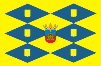 Bandera de proporciones 2:3. Losanjada par de azul y amarillo y en cada uno de los losanjes azules un escudete amarillo. Al centro, escudo municipal.