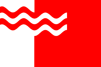 Red flag with a white hoist stripe as wide as 1/3 of the flag's length. Within an imaginary rectangle placed on the canton, as high as 43/100 of the flag's height and as long as 2/3 of the flag's length and set apart by 1/10 of the flag's height from the top of the flag, are inscribed four wavy stripes red-white-red-white, each as wide as 1/12 of the flag's height, showing two crests and two [beginning and end] half-crests, so that when their colour matches that of the field the stripe appears to merge seamlessly. Ratio 2:3.