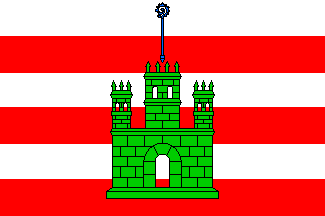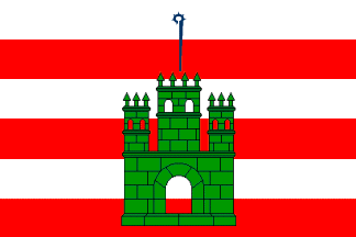 Horizontally striped flag white-red-white-red-white-red, on its centre a green castle with open gate and windows, as high as 1/3 of the flag's height and occupying all stripes except the top one. Centred on the top two stripes, a blue vertical abbot's crozier, separated 1/18 [of the flag's height] from the top [of the castle or of the flag? maybe both?].