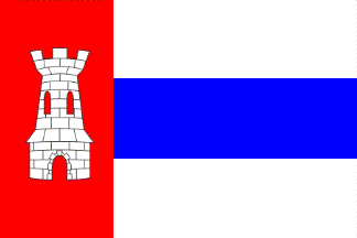 Flag: Rectangular, in proportions 2:3, made of three equal horizontal stripes, the outer white, the central blue, and of a vertical stripe placed along the hoist, covering 1/3 of the flag's length, red with a white tower.
