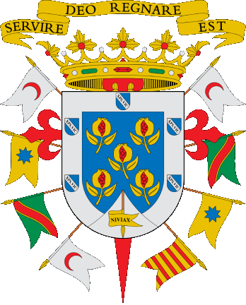 Description: Azure, five pomegranates Or, fruited Gules, arranged in saltire. A bordure Argent with five escutcheons Azure, one in chief and two on each flank, each charged with a bend Argent in turn charged with the inscription XPS.VIC in letters Sable. In base Argent, a lance Or, hafted in its natural color, pointing downwards, from which is attached a pennant Or with the inscription NIVIAX in letters Sable. Crested with a marquis's coronet, flanked by a Cross of St. James, surrounded by eight flags and with a ribbon Or bearing the motto SERVIRE DEO REGNARE EST.