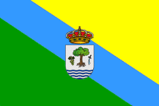 Flag: Rectangular, one and a half longer (from hoist to fly) than wide. Diagonally divided, reseda yellow, flag blue, and flag green; centered, all over, the local coat of arms.
