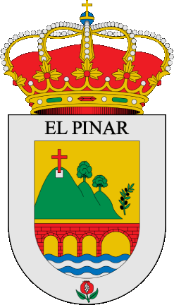 Description: On a gold field, three decreasing mountains forming a green mountain range towards the sinister, with a silver square surmounted by a red Latin cross on the highest peak, and a green tree on the other two peaks. To the sinister side of the range, a green olive branch with five black olives. In base, a red bridge, masoned in black and with gold openings, having four arches, the leftmost being twice as wide as the other three, over waves of blue and silver. A silver border, with the inscription 'El Pinar' in chief, and a red pomegranate, split silver and left green in base. The crest is a closed royal crown.