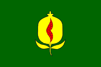 Flag: A green panel charged in the center with a yellow pomegranate slipped and leaved of the same and faceted in red.