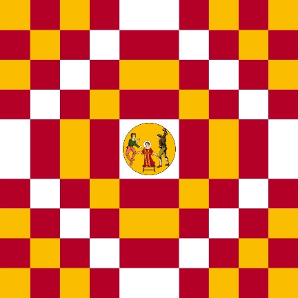 Reverse side of the flag: “Quadrangular, checkered in three enamels: gules, gold and silver, distributed in 100 checks, 10 on each side.