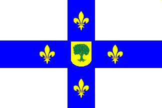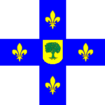 Flag: Argent a cross azure charged with four fleurs-de-lis or, one at each end of the cross, an escutcheon or an oak vert. Of square shape and with proportions 1:1.