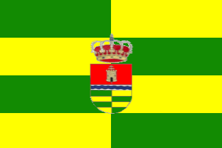 Flag: Panel in proportions 2:3. Counter barruly with four alternating barrulets, green and yellow, respectively. Charged in the center with the municipal coat of arms) with gules represented as red, azure as blue, vert as green, or as yellow, and argent and the pearls as white).