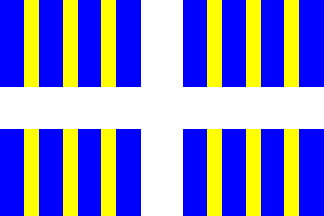 Flag: Rectangular flag, with proportions 2:3, made of a white cross throughout of 1/5 [of the flag's hoist] cantonned with seven vertical stripes, four blue and three yellow in turn, the blue stripes twice larger than the yellow stripes.
