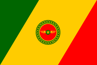 A few weeks ago I saw an unidentified flag in a news report on the departure of Ethiopian occupation troops from Somalia.  Footage was shown of the troops arriving home on a jetliner.  As they disembarked, several happily brandished a flag as I have illustrated above.  The row of X's in the green ring represents an illegible line of text, while wings suggest an air force affiliation.