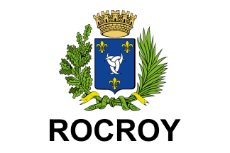 The flag of Rocroi (photo, photo) is white with the municipal coat of arms, "Azure three crescents argent interlaced between three fleurs-de-lis or two in chief and one in base" and the name of the municipality below, written as Rocroy (old spelling).