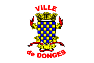 The flag of Donges featured in the 2000s in the catalogue of the Doublet flag maker (photo) was white with the greater municipal arms in the center, surrounded on top by "VILLE" (Town") and bottom by "DE DONGES" in red letters arranged in a semi-circular pattern.