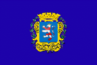 The flag of Wattrelos (photo, photo) is blue with the municipal coat of arms, "Azure, a lion barry argent and gules armed langued and crowned or".