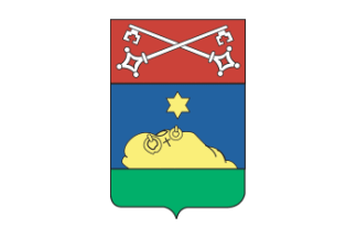 The flag of Pierre-Bénite (photo) is white with the municipal coat of arms, "Azure a rock or engraved with a Latin crosslet sable per bend flanked by two rings per bend sinister the dexter one bigger surmounted by a six-pointed mullet all the base vert the chief gules two keys argent saltirewise with lozengy pommety rings".