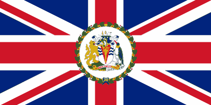 The flag of the commissioner of the British Antarctic Territory is a Union flag defaced with a white disc with a gold edge, covered by a laurel wreath, with the full achievement of arms in the centre. An interesting feature is the gold ring under the laurel. I have seen references to the governor of Gibraltar's flag where the presence of the gold ring is associated with the gold border that sometimes appears on the Gibraltar arms. I suspect from this flag, that all governor/commissioner flags that bear a laurel wreath are meant to have a gold ring under them.