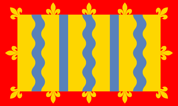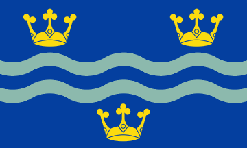 The new flag of Cambridgeshire has been announced. The design by Brady Ells has three gold crowns to represent East Anglia, in which Cambridgeshire is located. They are placed against a blue field which is the same shade used on the East Anglia flag. The wavy lines represent the River Cam and are in the colours of Cambridge University. (source)