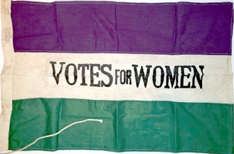 with the purple, green and white flag of the Women's Social and Political Union.