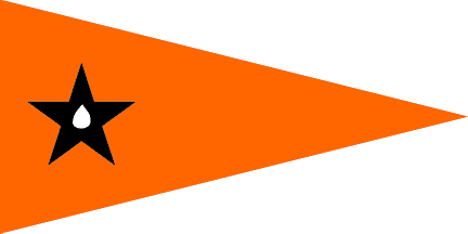 Burgee: Pennant circa 2:4. Deep orange field charged with a white teardrop (chocolate pod?) within a black star centred 1 unit from hoist.